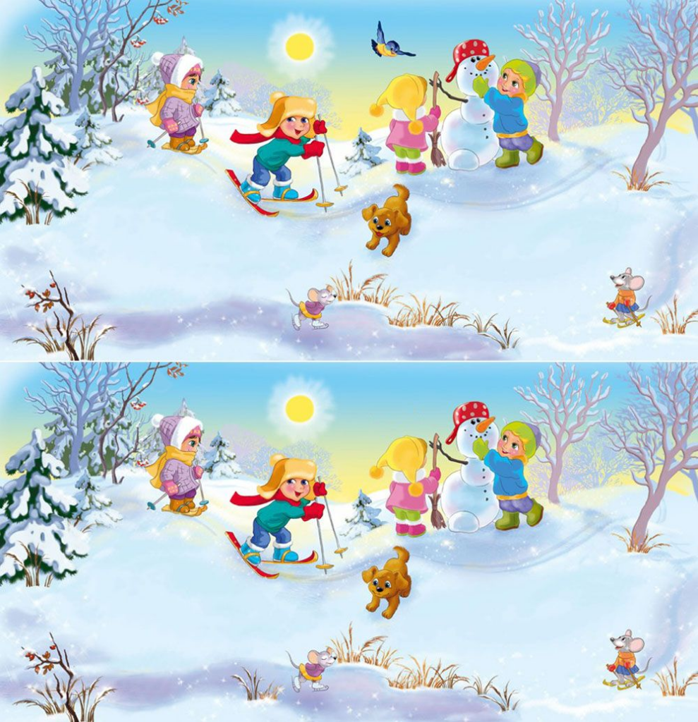 - Знайти відмінності: порівняння двох майже однакових зимових малюнків (наприклад, пейзаж із зайчиком), пошук 7–10 тонких відмінностей;