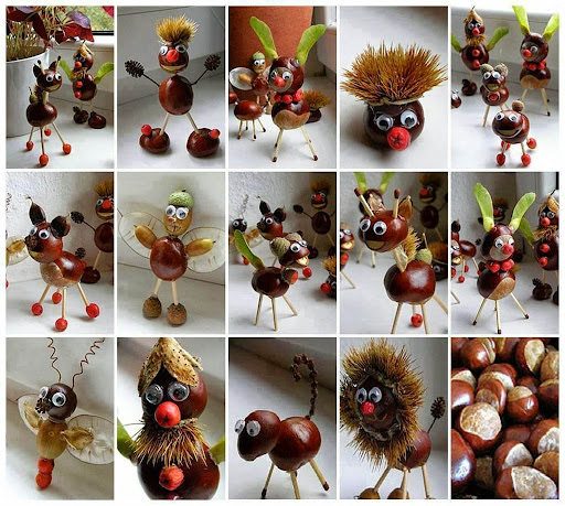 Окрім плоских аплікації, осінь пропонує безліч матеріалів для створення об’ємних фігурок. Каштани, жолуді та шишки — це ідеальний конструктор, який не вимагає великих витрат, а лише клей або пластилін.