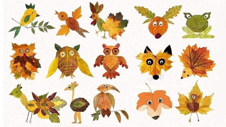 - Лісові звірі: створення портретів тварин, де листя виступає в ролі гриви лева, вушок зайця або голок їжака. Використовуйте листя різних кольорів та розмірів для надання об’єму.