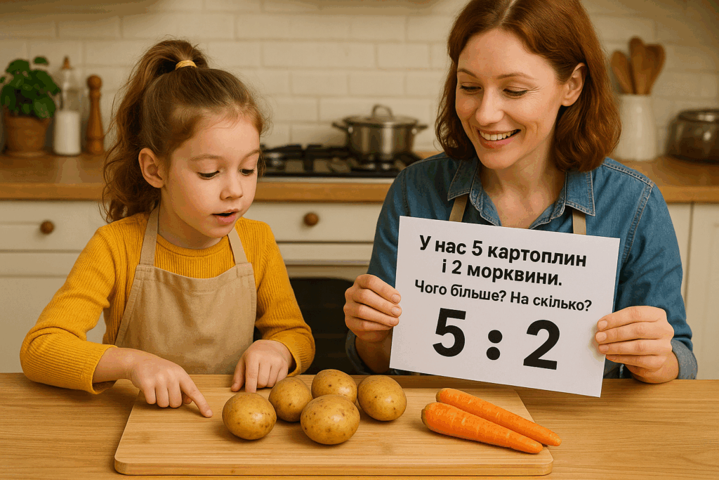 - Порівняння інгредієнтів: під час приготування, порівнюйте кількість інгредієнтів: «У нас 5 картоплин і 2 морквини. Чого більше? На скільки?».