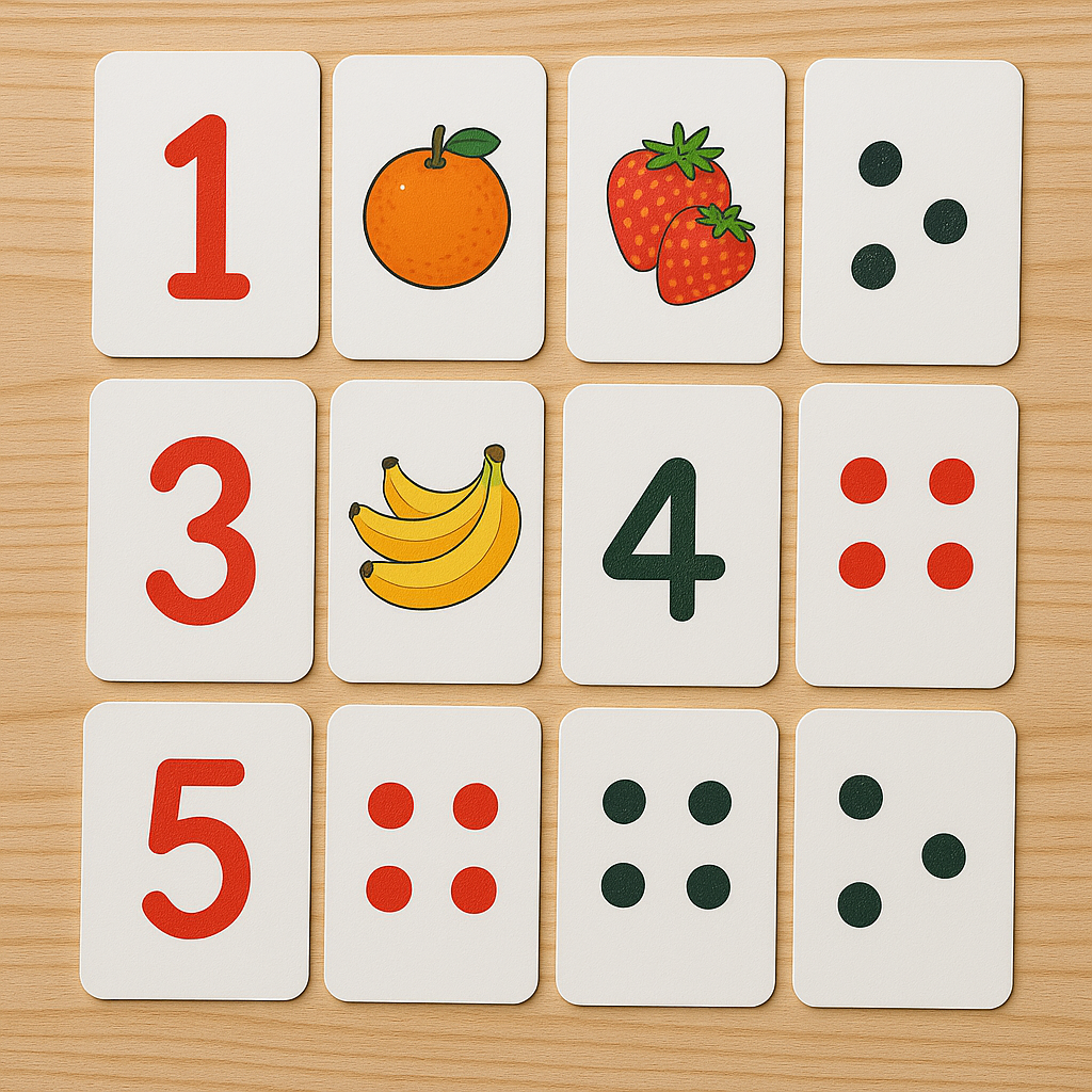 - Картки «Цифра-кількість»: створення або придбання карток, де на одній зображена цифра, а на іншій — відповідна кількість предметів (крапок, фруктів). Гра полягає у пошуку пар.
