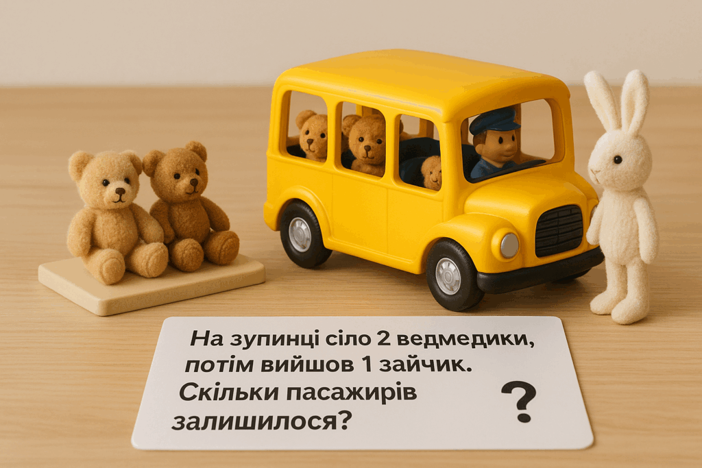 - «Автобус» для іграшок: використовуйте іграшковий автобус, щоб “підбирати” та “висаджувати” пасажирів (інші іграшки). Наприклад, “На зупинці сіло 2 ведмедики, потім вийшов 1 зайчик. Скільки пасажирів залишилося?”.